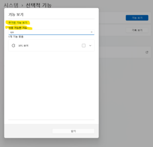 그러면 선택적 기능 화면으로 바로 이동합니다. 여기서 XPS Viewer를 검색해 추가하면 됩니다. 마이크로소프트 문서에도 이 방식이 소개되어 있습니다.